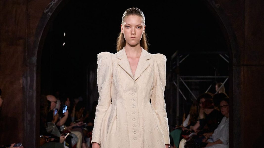 Meruert Tolegen seems to be living a fashion dream. Since launching her line in 2021, the designer has been a finalist for both the LVMH and CFDA/Vogue Fashion Fund prizes, and in the coming week will open her own boutique at 39 Wooster Street. “I feel it’s kind of surreal that they even considered me for anything,” the soft-spoken designer said in a pre-show interview. “I learned a lot from my peers, the designers I’ve had around me. It’s been a really nice and humbling experience.”
