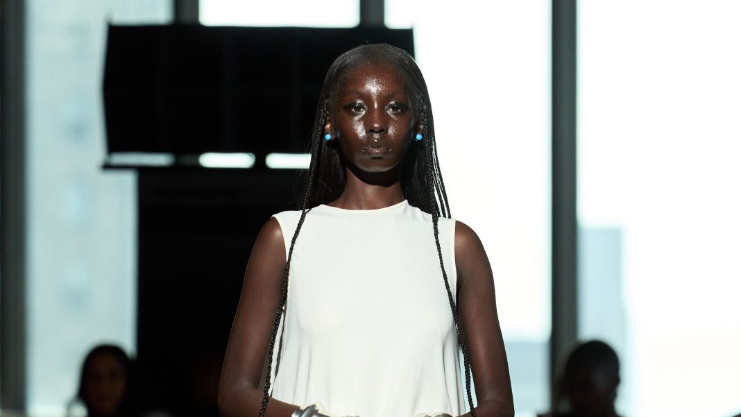 Shortly before Head of State designer Taofeek Abijako’s spring show kicked off at the WSA building downtown this afternoon, guests were greeted with the calming sound of rolling beach waves crashing in and out—a welcomed ASMR-worthy soundtrack, given that the chaos of New York Fashion Week is anything but serene. Once the collection started coming down the catwalk, that sense of grounding continued: The first look saw a model slowly saunter down the runway barefoot, wearing a simple white sleeveless dress with a shapely circular hemline, achieved with built-in wiring along the trim. It was like the fashion equivalent of a breath of fresh air.